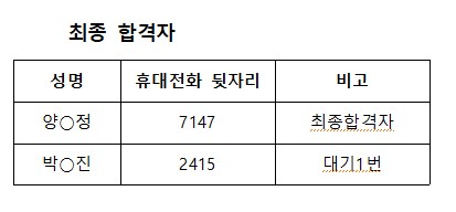 세종시립요양원 직원(영양사) 최종합격자를 다음과 같이 공고 합니다.